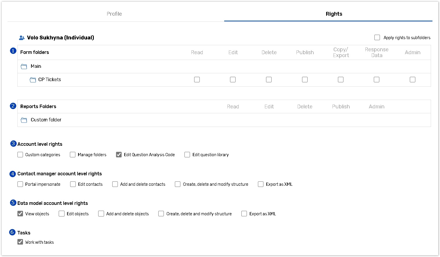 Surveys and reports can be moved between folders with the same set of rights assigned for this user.