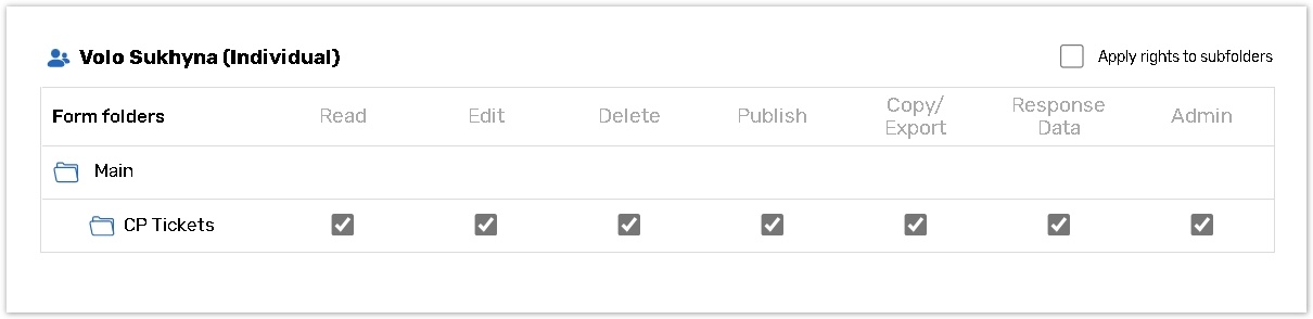 Select the Apply Rights to Subfolders option to automatically activate corresponding access rights to all nested folders. If this option is not selected, the access rights may be given separately to folders and their subfolders one by one.