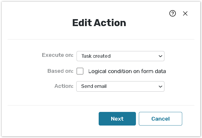 If there is a form linked to the current task definition, the Based on: Logical condition on form data checkbox will be visible. Check it if you want the following action to be triggered by certain form answers.