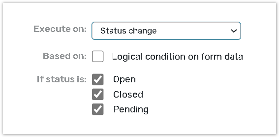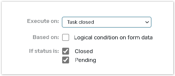 If Task closed was selected in the Execute on dropdown box, the statuses that you have marked as such that close the task (in the Statuses tab) are displayed.