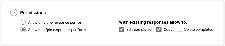 Specify the number of responses you wish to collect from each respondent per form. Allocate the response modification rights (Edit completed, Copy, Delete completed) for users of the portal, which are also applicable to the users of the Mobile application.