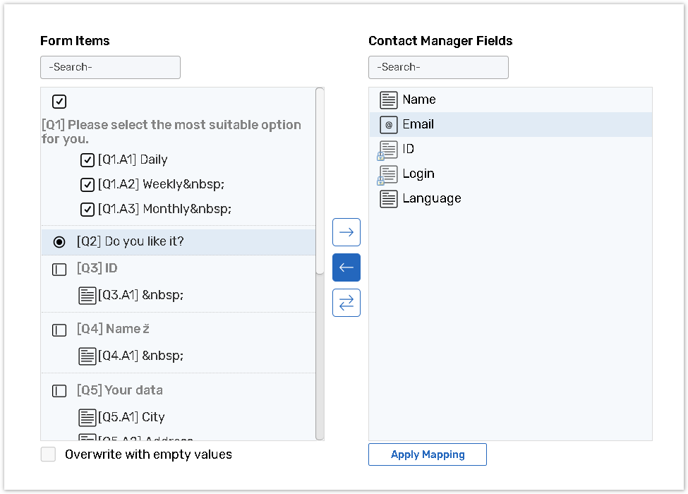 Example: When respondents change their living address, job position, email and other personal details, you can update contact records with the up-to-date information. You can also prepopulate survey questions with the data from the Contact Manager. For more details consult the Data Flow chapter.