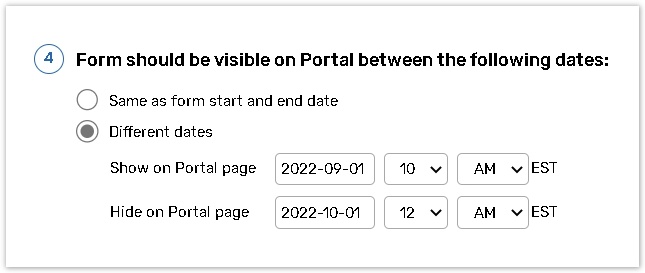 If you wish to choose different dates when the form should be visible on the Portal use the Different dates option.