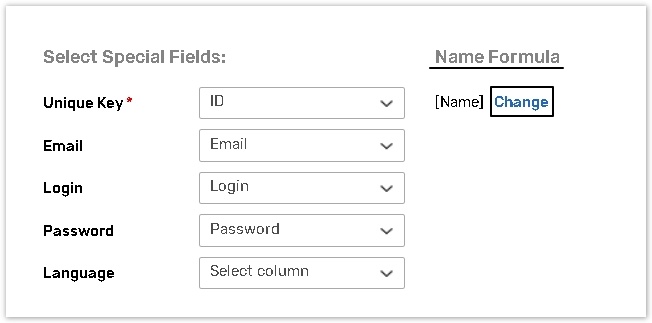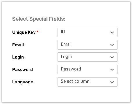 When all the fields are added, under the Select Special Fields, indicate the fields that will be used as a Unique Key, Email, Login, Password, and Language.