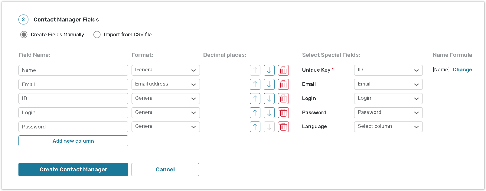 Contact Manager Object fields are created automatically according to the imported file. Proceed with editing the default column names and set their formats.