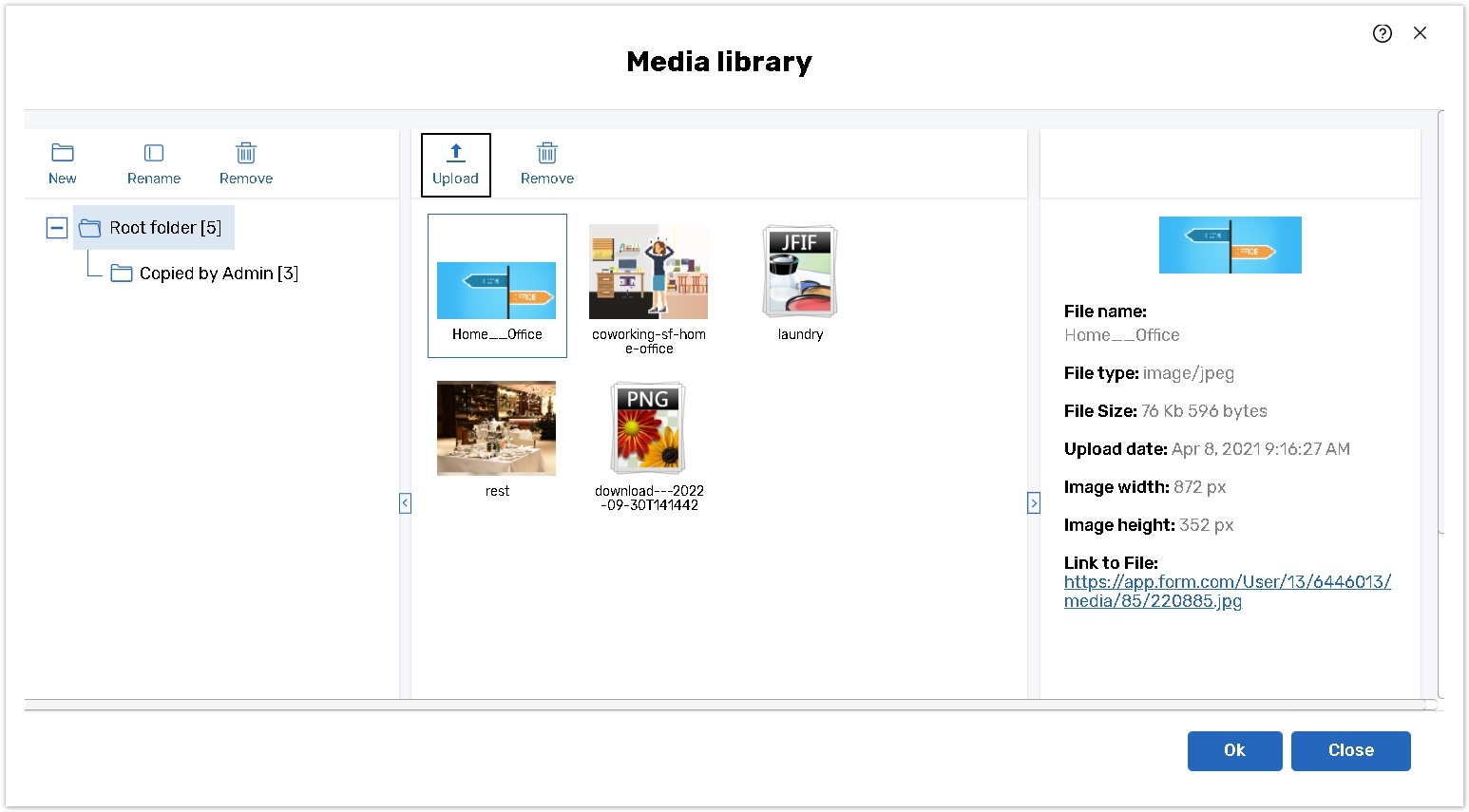 The Media library pop-up will be opened. Click on the Upload button to select a new image you wish to attach or select an already uploaded image.