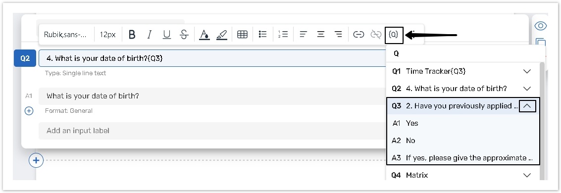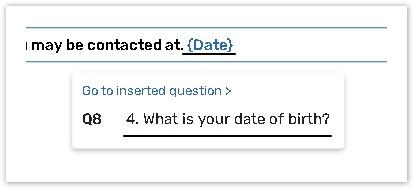 Once you have clicked on a question, answer, or column, a corresponding piping token will be created automatically in the focused input field with curly brackets ( {} ).