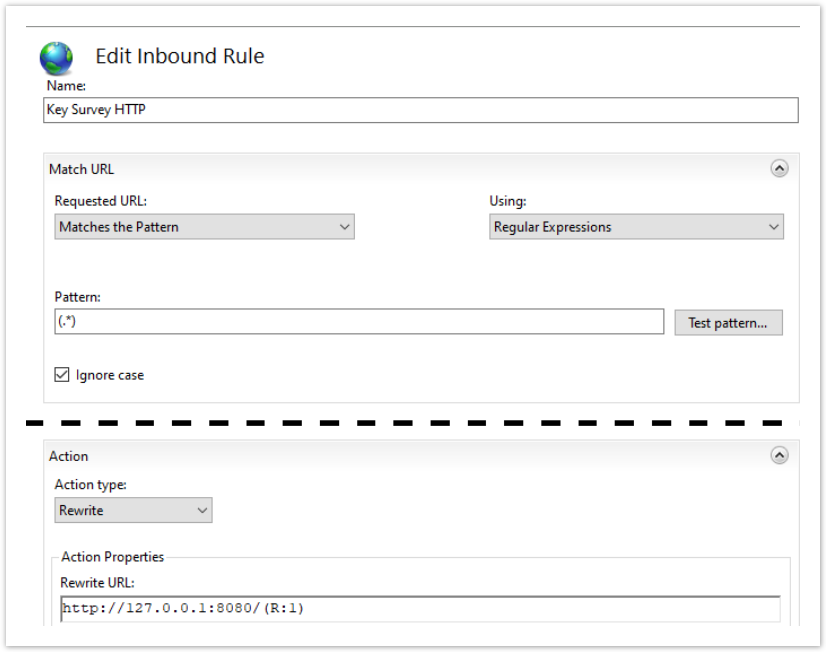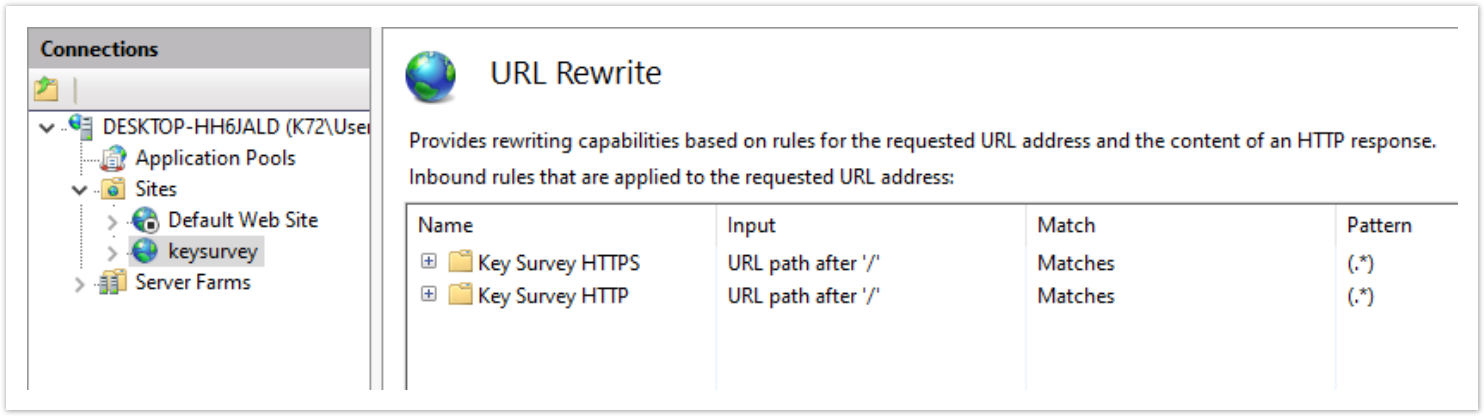 It is assumed that HTTP Web site is successfully setup at this point. In this section we will add HTTPS binding to Key Survey Web site and adjust URL Rewriting to work with HTTPS clients. URL Rewriting setup is similar to HTTP site. The difference is adding HTTP Header X-Forwarded-Proto to client's requests to let Key Survey application know that client is using HTTPS.