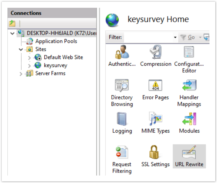 a. On the left-side pane tree select KeySurvey Web site and launch a 'URL Rewrite' tool: