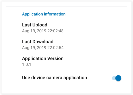 Application information includes your current Application Version, the Last Upload / Last Download dates and time and the Use device camera application toggle button.