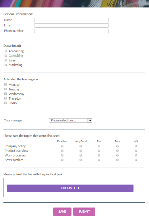 Name | Phone Number | Department | Attended Trainings on | Manager | Company policy | Product overview | Work processes | Best Practices | File | |