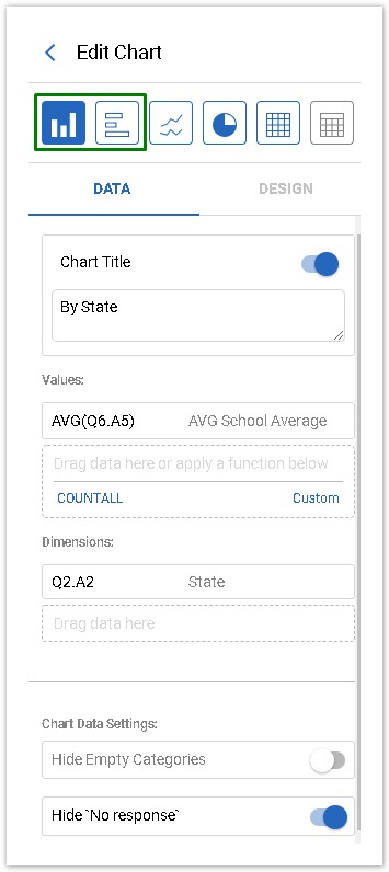 To create a Bar chart, add values and dimensions from the Data Source tab by dragging and dropping them to the corresponding fields of the Edit Chart Panel.