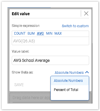 When setting up Values, you may choose to show data as absolute numbers or as percentages: