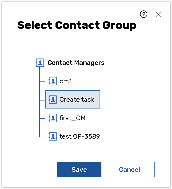 The system displays the Select Contact Group dialog of your Contact Managers and contact groups. You can choose a Contact Manager or a group within it and press the Save button.