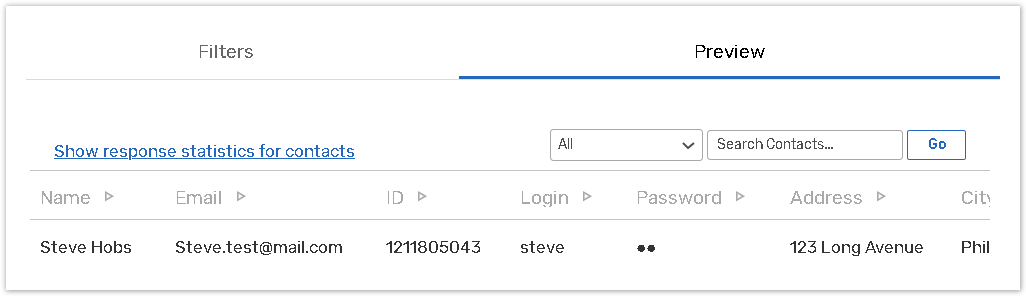 Under the Preview tab, a list of contacts selected by the filter together with their Portal profile data is displayed. Contacts can also be searched by different indicators that can be selected from the dropdown next to Search Contacts text box. The Show response statistics for contacts link provides information on survey completion process by users selected.