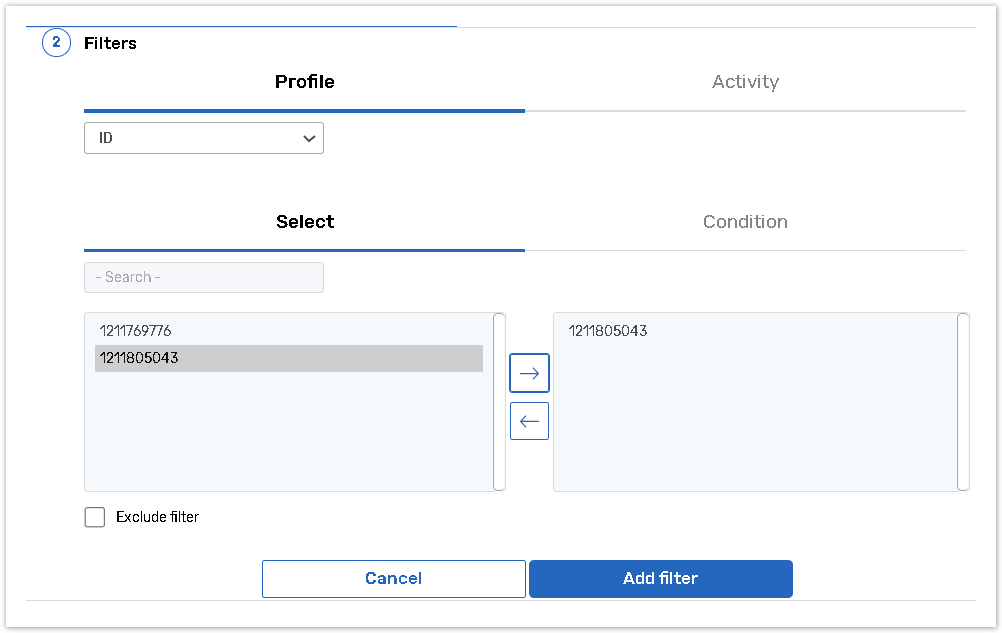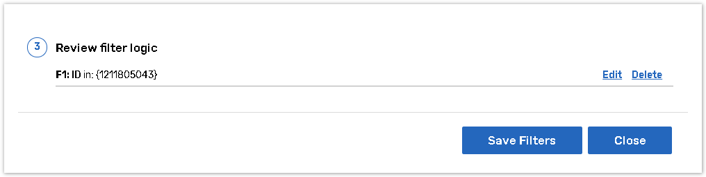 Press the Add filter button. Several filters can be added. All the applied filters can be viewed in the Review filter logic section. You may combine the filters using the AND, OR or custom logic conditions.