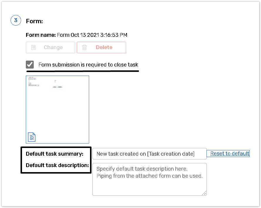 After you have saved a form, the Form section of the Basics tab will contain the form name, as well as preview, Change, Delete icons and the Default task summary and description tabs.