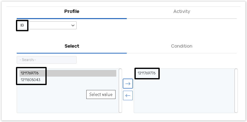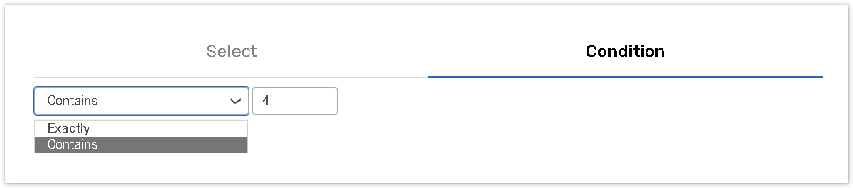Use the Condition tab to manually input values that will fully match those of contact manager or be contained in them.
