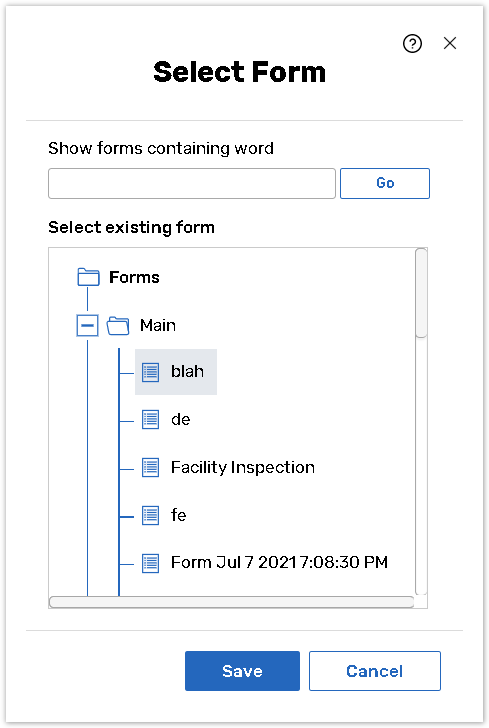 In the dialog box that will pop up, select a form from a tree and hit Save. If you wish to filter forms by text they contain, type the text into the Search box.