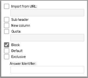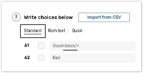 Or Insert the <BLOCK/> tag next to the answer choice. The answers input mode must be switched to Standard before inserting the tag.