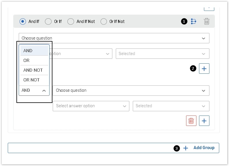 Operators: AND(=&&), OR (=||), NOT (=!) | Q3.A1 AND Q3.A3, Q7.A3.C1 OR Q7.A3.C2, NOT Q2.A1 |