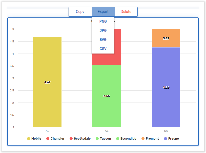 Bar charts, line charts and pie charts can be exported to CSV, as well as PNG, JPEG and SVG image formats.
