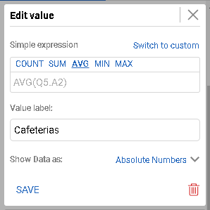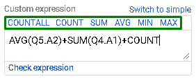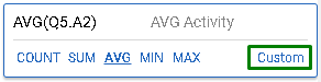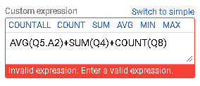 Custom expressions - A mathematical operation that uses standard functions (e.g., AVG(Qx.Ay)) or static numbers as its operands and a number of arithmetic expressions as its operators. If you need to perform calculations of scores, percentages combining data from different questions or answer options, you may input a custom expression.