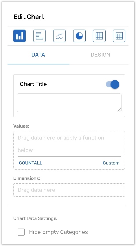 The Design tab presents options depending on the Chart or Table type, as well as the combination of dimensions and calculations in the chart data. | |