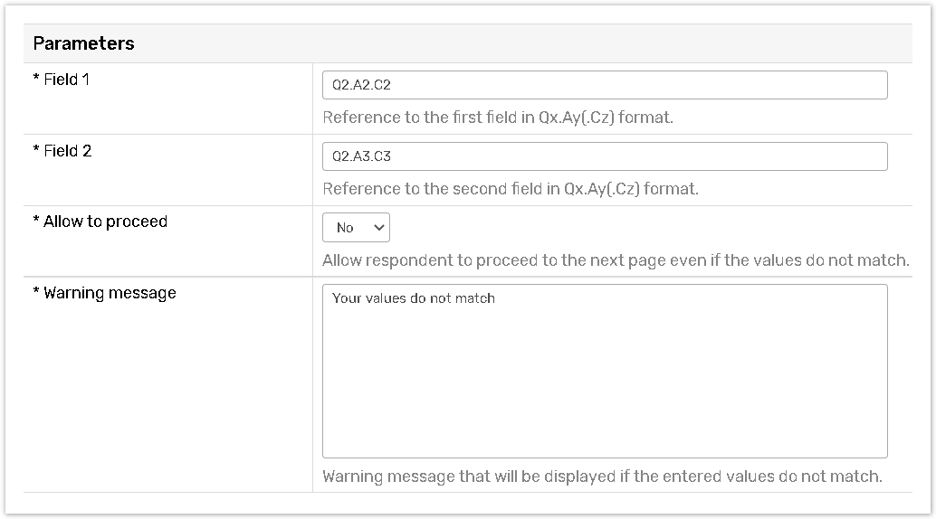 Allow to proceed - Specify either to allow or to restrict the respondent to proceed to the next page even if the values do not match.