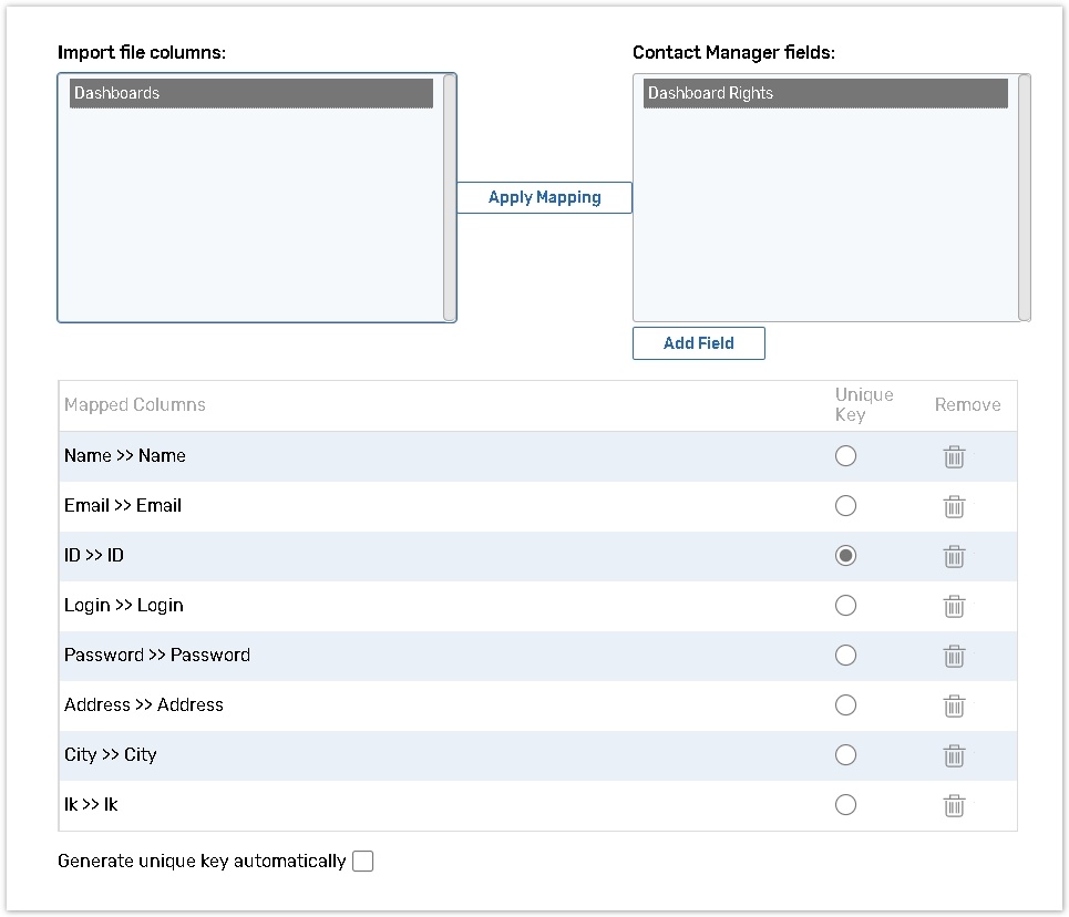 Select the column to use as a unique identifier so there are no duplicates within the Contact Manager. You can also use the Generate unique key automatically option, thus the data from the imported file will be overwritten with the random 9-digits unique codes and saved to the Contact Manager.