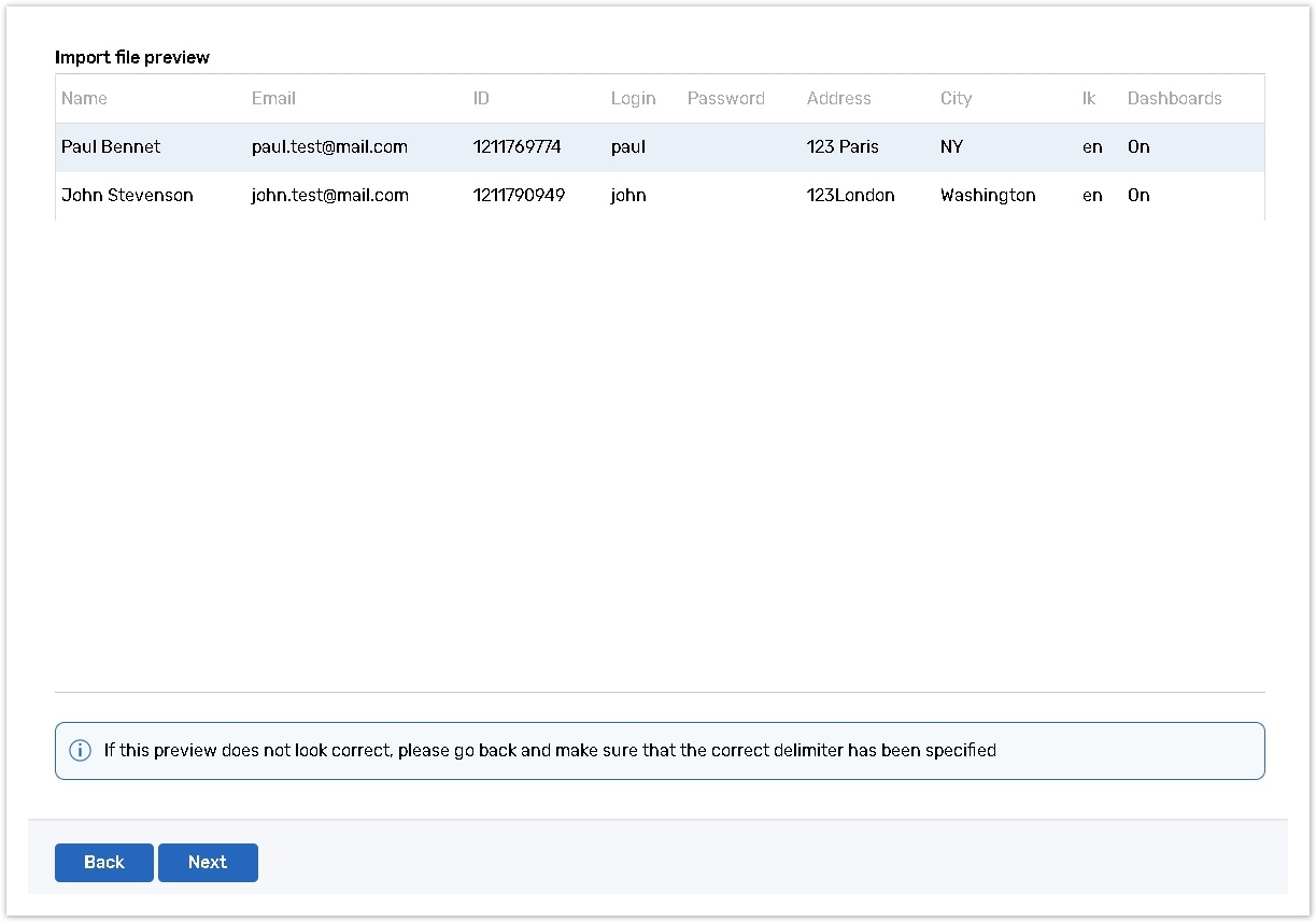 Confirm the accuracy of the file on the Import file preview page. Press the Next button to proceed with the Import process.