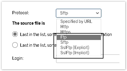 If an import of the file from the network or internet was selected, it is possible to select one of the protocols to be used (HTTP/HTTPS/FTP/SFTP/SslFtp (explicit or implicit)).