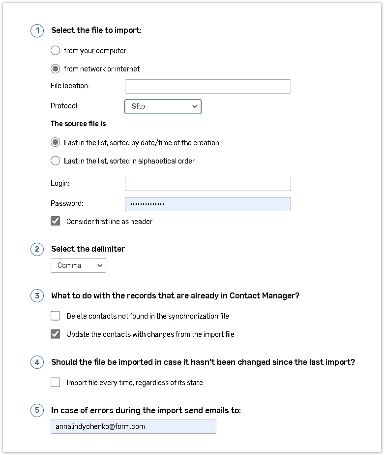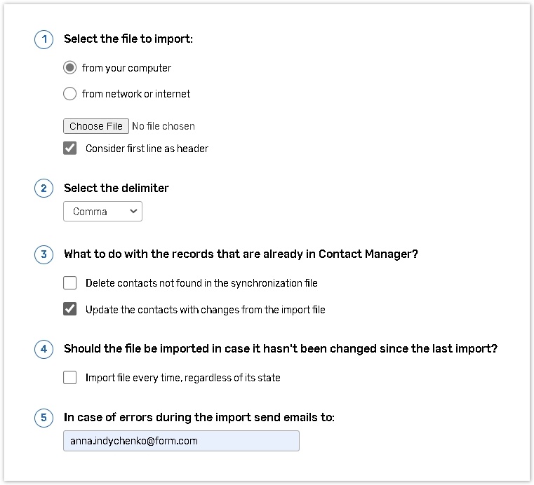 Specify an email in case of errors during the import of emails to be sent to. If you wish to import the file every time, even if it has not been changed after the last import, select the checkbox under step 4: Import file every time, regardless of its state.