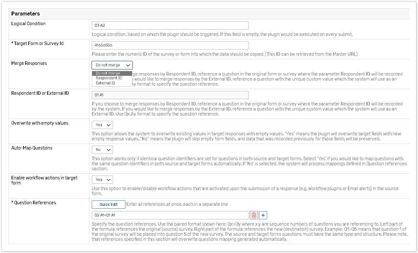 If the Copy responses plugin is applied to a form along with the Respondent ID Saver plugin, the Respondent ID Field and Copy Respondent Id parameters must reference different questions in order for these plugins to work properly.