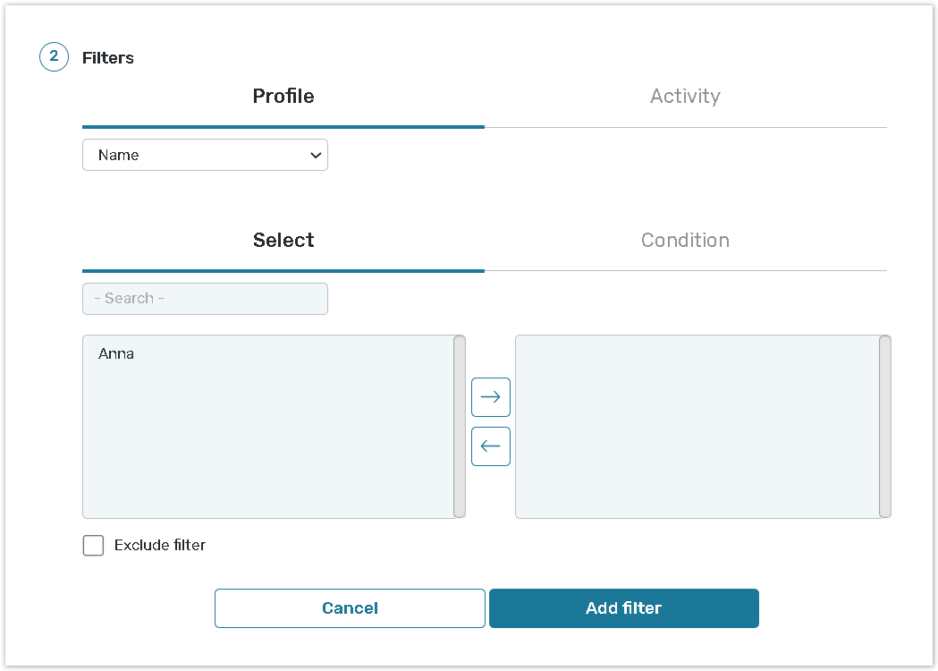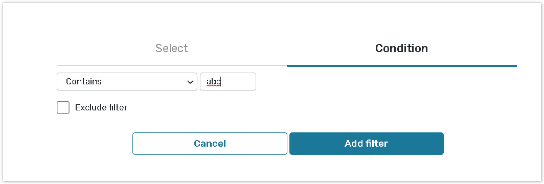 You can either select one of the options in the selected field based on which the contacts will be filtered, set the condition based on this option. For instance, you can create a group of respondents with First names that contain “abc”: