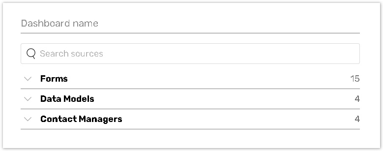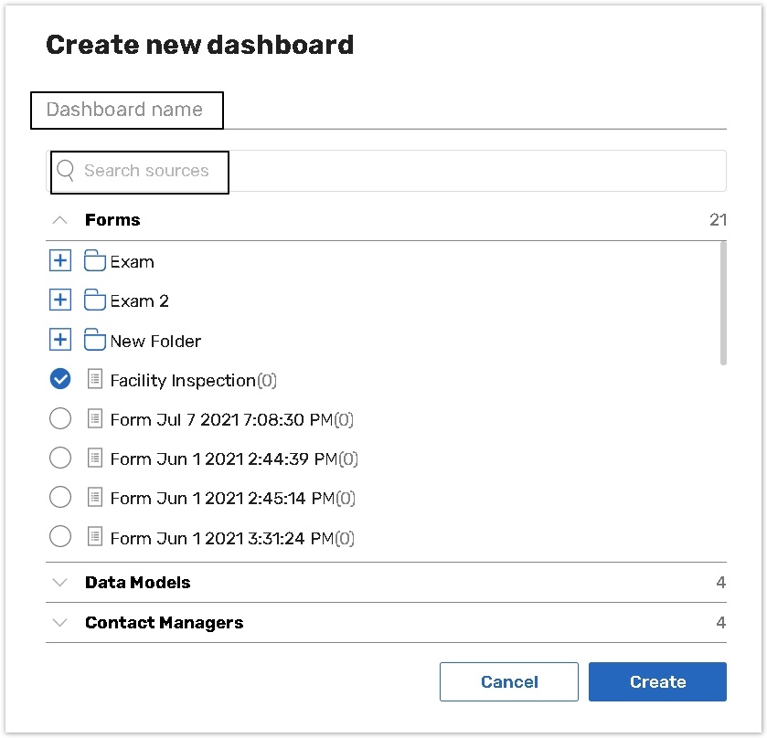 To create a Dashboard, you can use only 1 item from the list of either Forms, Data Models or Contact Managers.