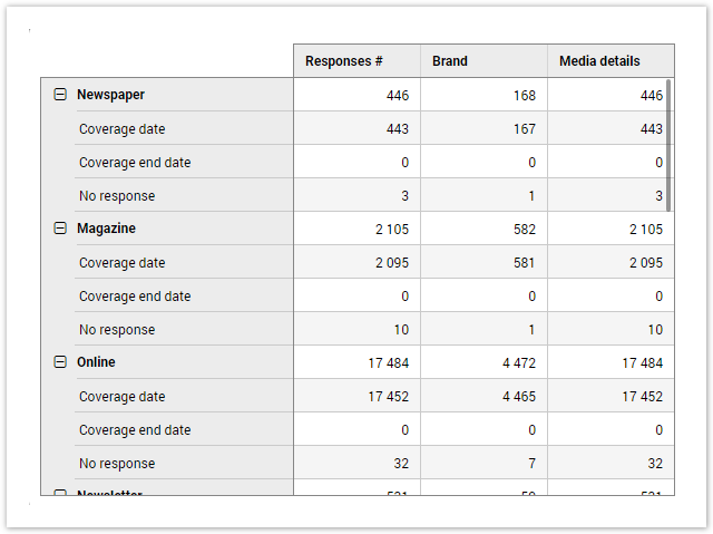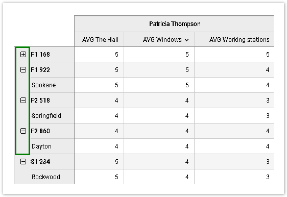 If multiple dimensions (rows and columns) are added, they will be grouped. Multiple dimensions in columns will be displayed as sub-columns, and multiple dimensions in rows will be displayed as a tree. The first dimension will become the parent element (in bold), which you will be able to collapse/expand to show or hide sub-rows: