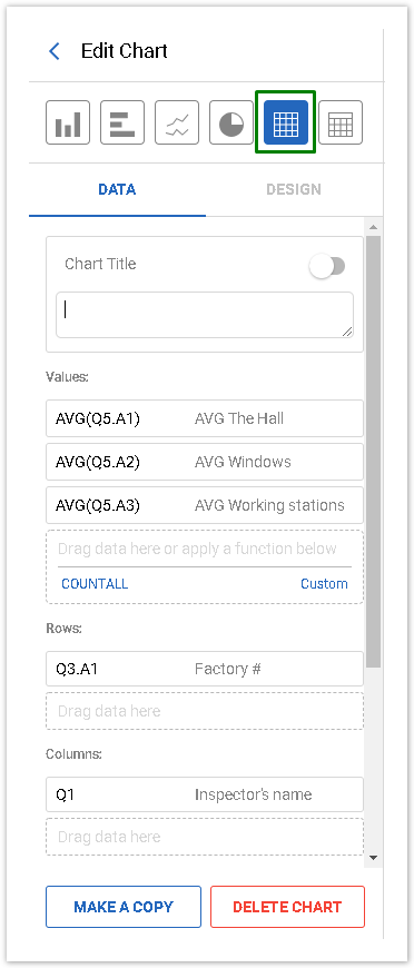 To create a Crosstab chart, add values and dimensions from the Data Source tab by dragging and dropping them to the corresponding fields of the Edit Chart Panel. For Crosstabs, calculations are named Values, and dimensions are called Rows and Columns: