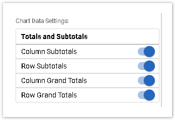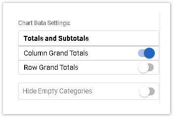 Once one Row and one Column is added, the option to display Totals becomes available in Chart Data Settings with the Column Grand Totals option turned ON by default: