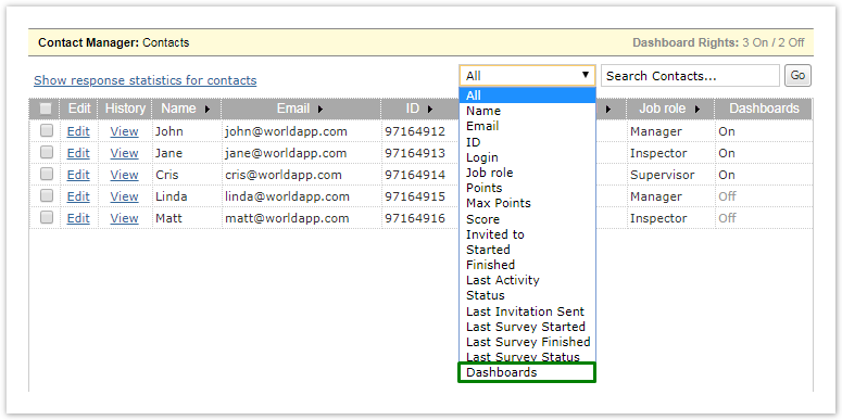 Once Dashboard rights are enabled, you can filter the list of contacts by Dashboard rights to see only those for whom they were enabled or disabled.