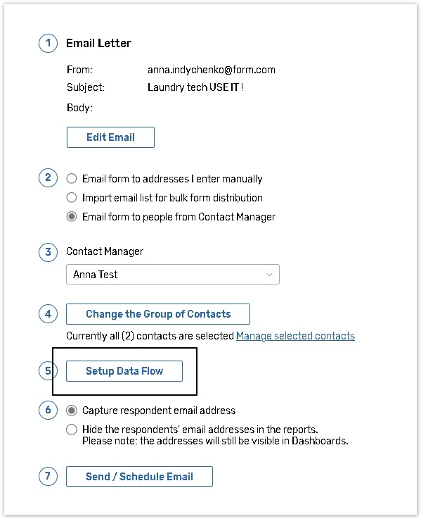 On the Data Flow page you can setup mapping between form questions and fields of the Contact Manager.