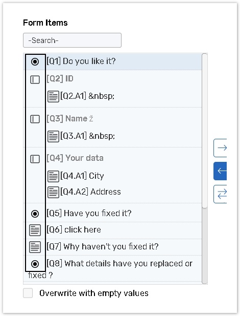 The Form Items pane lists all form questions. Icons which are located next to questions indicate question types.