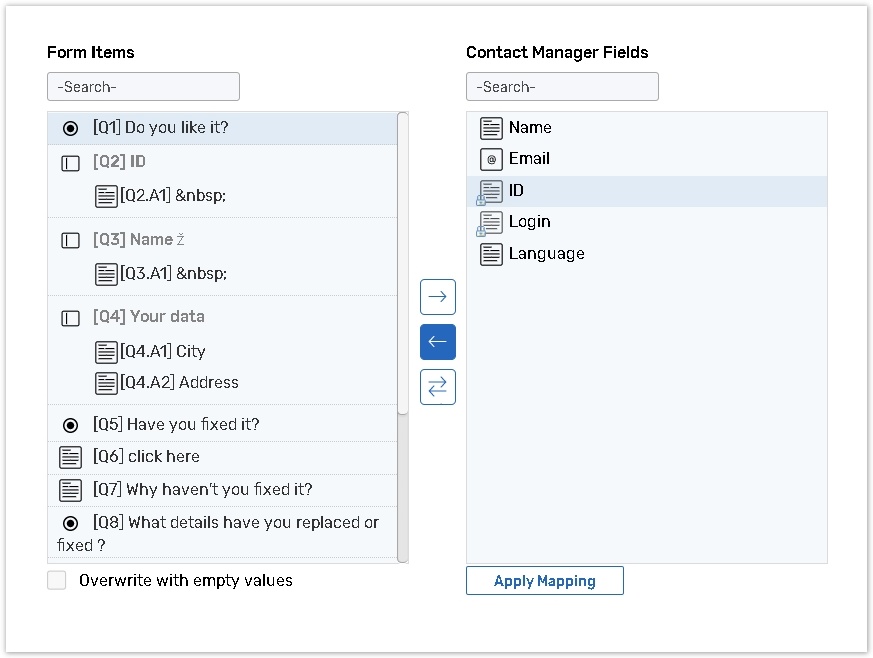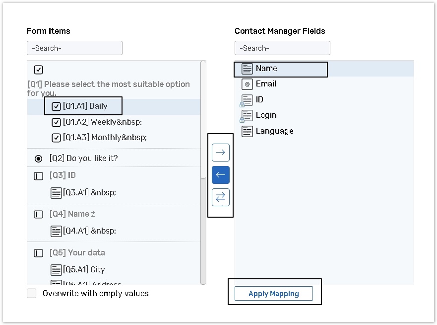 The Overwrite with empty values option is used if respondents leave a question unanswered and you want delete data from the appropriate field in the Contact Manager. This is applicable for the To and To and