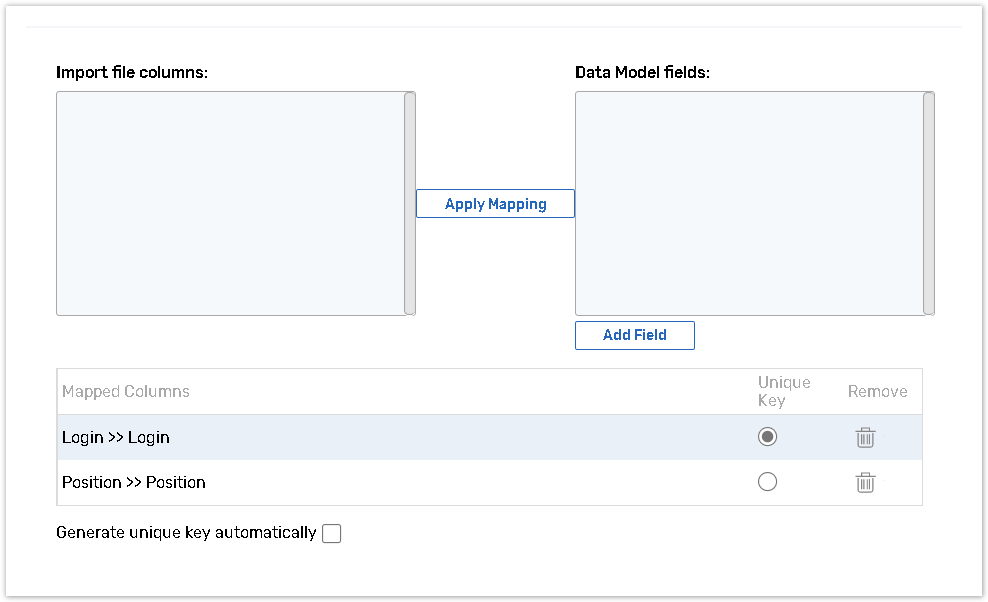 If you are importing objects to an existing data model, on the Mapping page, you can map .CSV file fields to the fields already present in the Data Model. If the data file contains more fields than appear in the Data Model, you can add new Data Model fields right from this page.