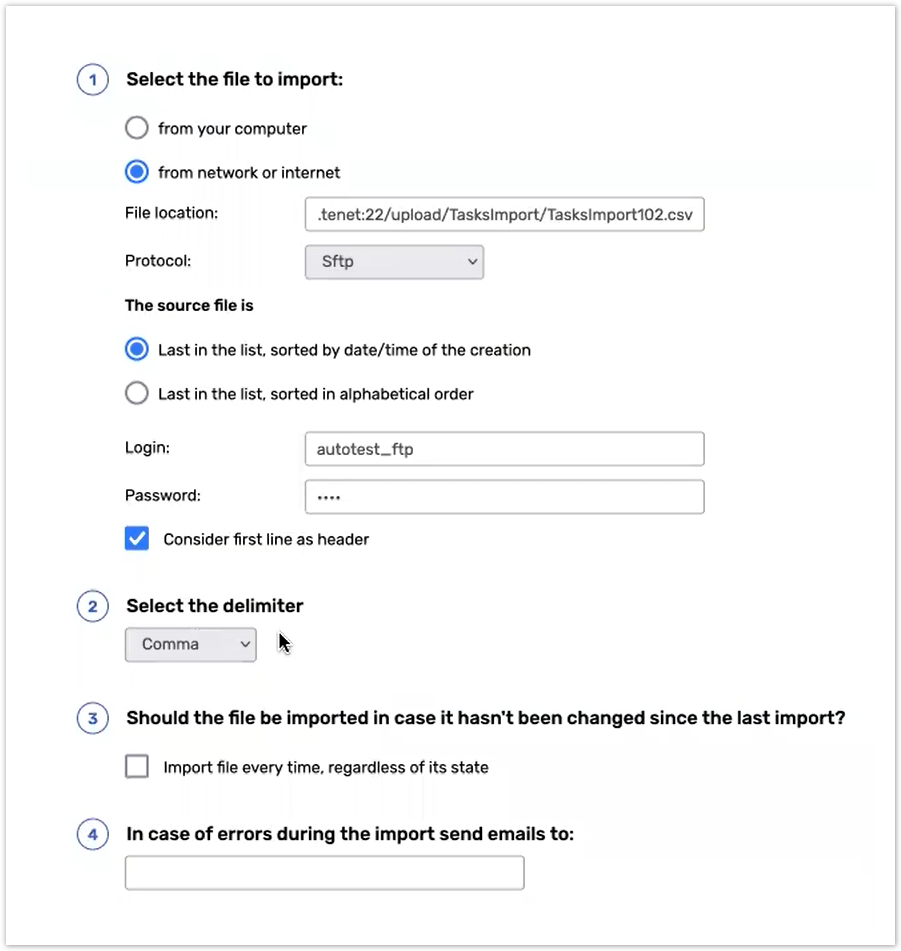 On the Import settings page, select the file to import. The platform provides 2 options - it is possible to upload the file either from your computer or from the network or the internet.