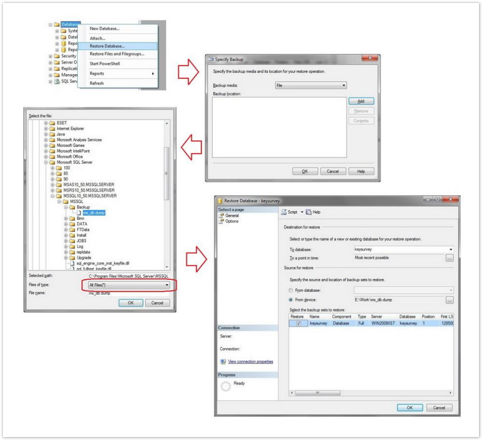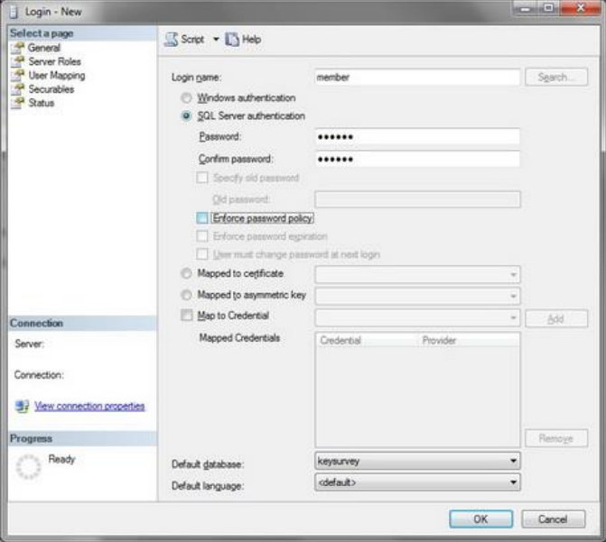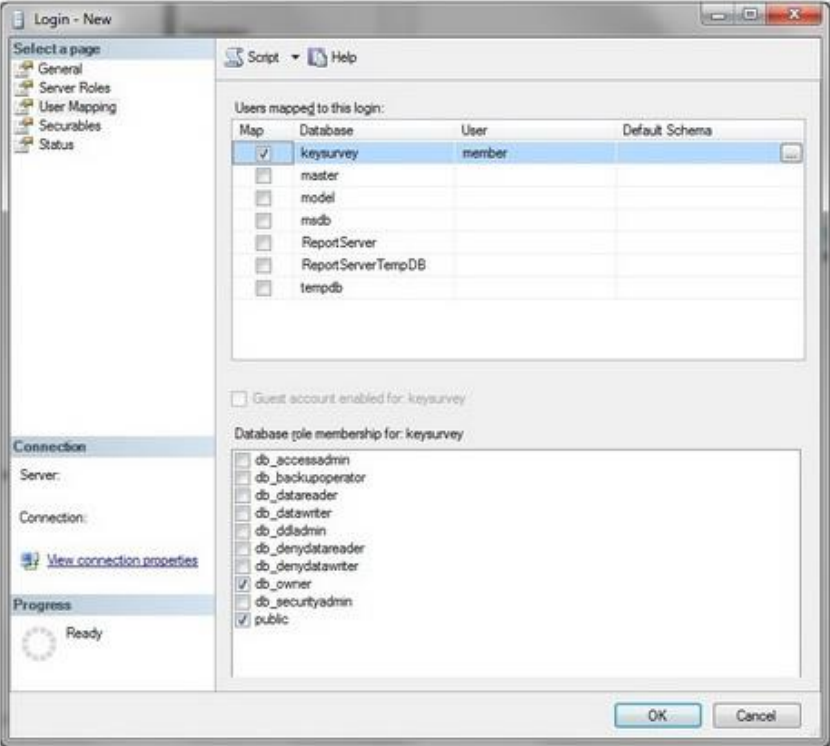 Once all these steps are done, click 'Ok'. Refresh MS SQL Object Explorer. 'keysurvey' database should now appear in database list.
