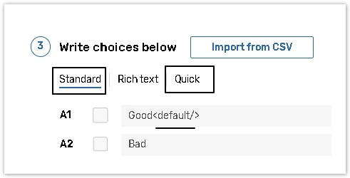 Or Insert the <default/> tag next to the answer choices you want to mark as default.