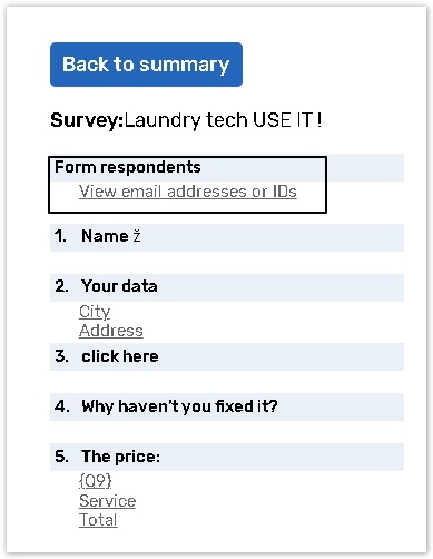 Click the View email addresses or IDs link to see the list of all respondents who submitted responses. Click respondent's link (ID) to view their response.