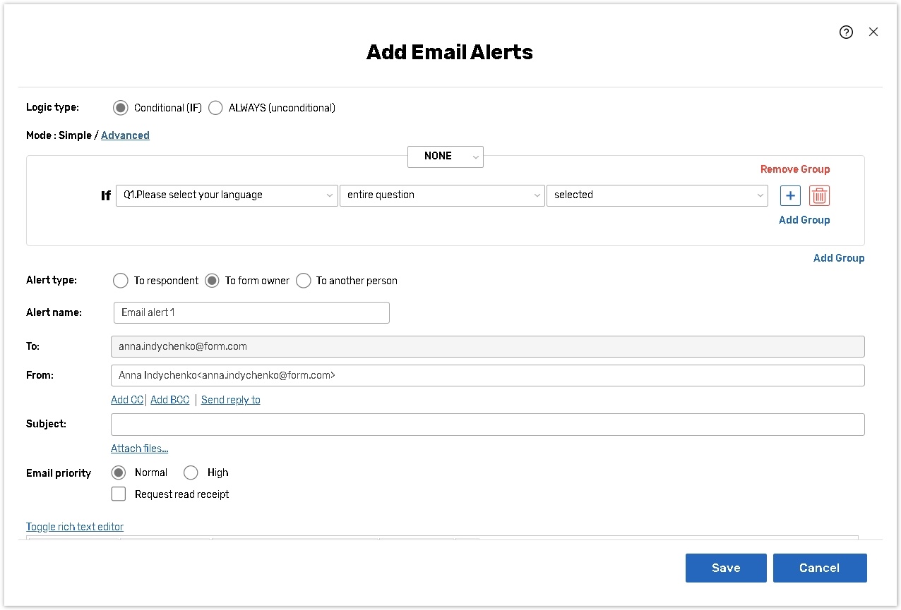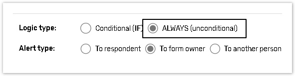 If To respondent is selected, the email alert will be sent to an address provided by a respondent.