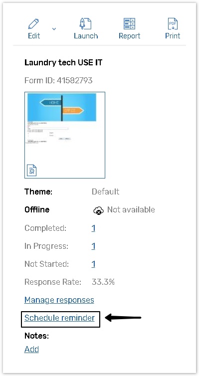 To open this section, go to the Forms home page, select the survey to schedule/edit reminder for and click the Manage Reminders link from the Information pane;